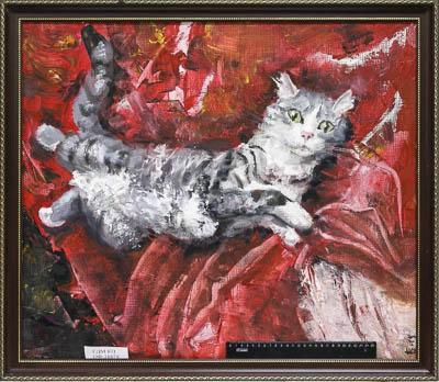 Картина оформлена в раму коричневого цвета. Кот изображён лёжа на драпировке розово-красного цвета, которая в свою очередь покрывает диван (или кушетку, кровать и нечто подобное)