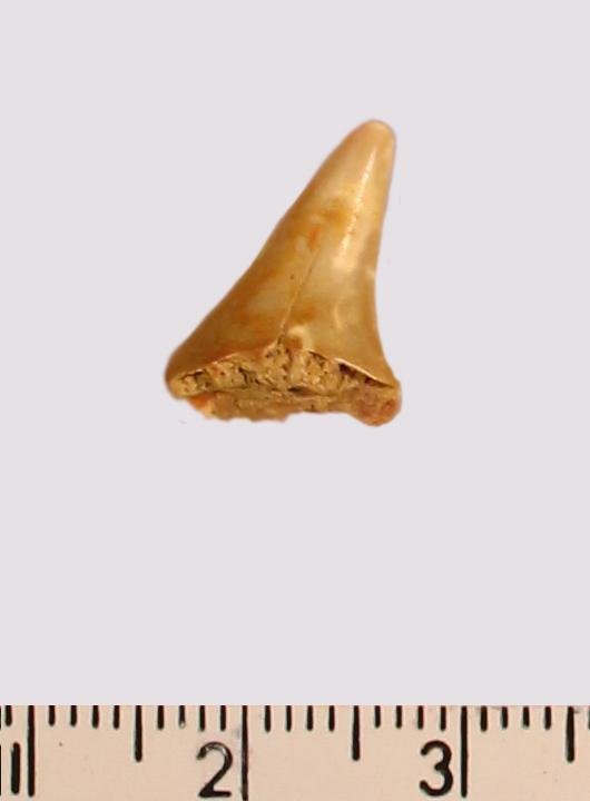 Зуб (фрагмент). Акула. Scapanorhynchus raphiodon (Agassiz, 1843). Классификация: Хордовые Chordata, Позвоночные Vertebrata, Хрящевые рыбы Chondrichthyes, Пластиножаберные Elasmobranchii, Акулы Selachii, Ламнообразные Lamniformes
