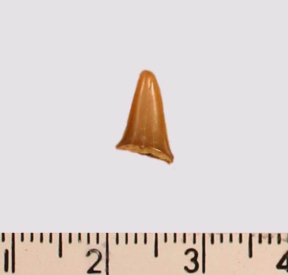 Зуб (фрагмент). Акула. Scapanorhynchus raphiodon (Agassiz, 1843). Классификация: Хордовые Chordata, Позвоночные Vertebrata, Хрящевые рыбы Chondrichthyes, Пластиножаберные Elasmobranchii, Акулы Selachii, Ламнообразные Lamniformes