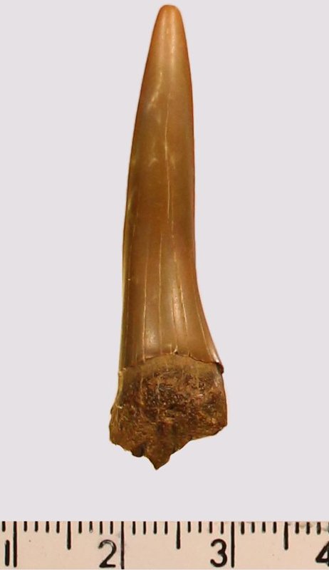 Зуб (фрагмент). Акула. Scapanorhynchus raphiodon (Agassiz, 1843). Классификация: Хордовые Chordata, Позвоночные Vertebrata, Хрящевые рыбы Chondrichthyes, Пластиножаберные Elasmobranchii, Акулы Selachii, Ламнообразные Lamniformes