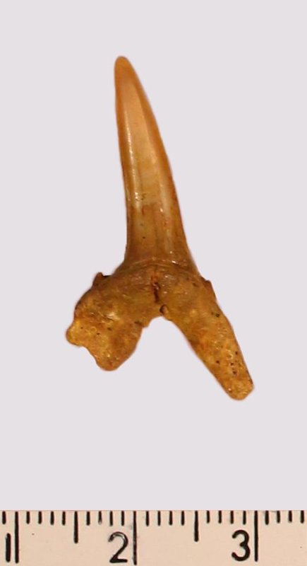 Зуб. Акула. Scapanorhynchus raphiodon (Agassiz, 1843). Классификация: Хордовые Chordata, Позвоночные Vertebrata, Хрящевые рыбы Chondrichthyes, Пластиножаберные Elasmobranchii, Акулы Selachii, Ламнообразные Lamniformes