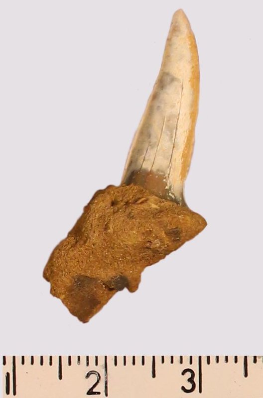 Зуб. Акула. Scapanorhynchus gigas Woodward 1889. Классификация: Хордовые Chordata, Позвоночные Vertebrata, Хрящевые рыбы Chondrichthyes, Пластиножаберные Elasmobranchii, Акулы Selachii, Ламнообразные Lamniformes