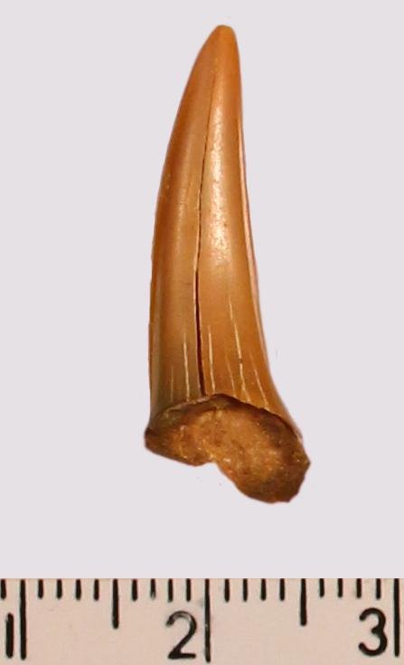 Зуб (фрагмент). Акула. Scapanorhynchus gigas Woodward 1889. Классификация: Хордовые Chordata, Позвоночные Vertebrata, Хрящевые рыбы Chondrichthyes, Пластиножаберные Elasmobranchii, Акулы Selachii, Ламнообразные Lamniformes