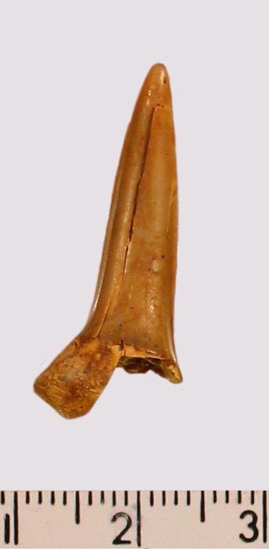 Зуб (фрагмент). Акула. Scapanorhynchus gigas Woodward 1889. Классификация: Хордовые Chordata, Позвоночные Vertebrata, Хрящевые рыбы Chondrichthyes, Пластиножаберные Elasmobranchii, Акулы Selachii, Ламнообразные Lamniformes