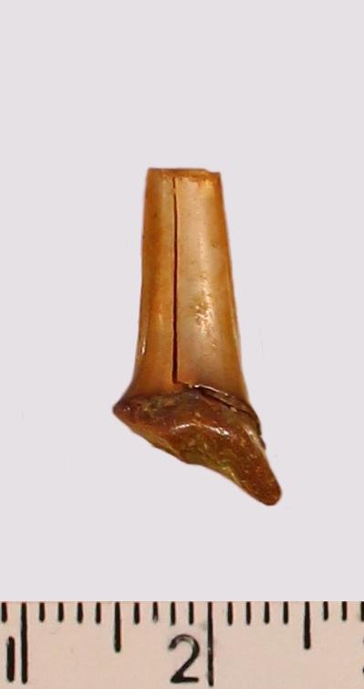 Зуб (фрагмент). Акула. Scapanorhynchus gigas Woodward 1889. Классификация: Хордовые Chordata, Позвоночные Vertebrata, Хрящевые рыбы Chondrichthyes, Пластиножаберные Elasmobranchii, Акулы Selachii, Ламнообразные Lamniformes