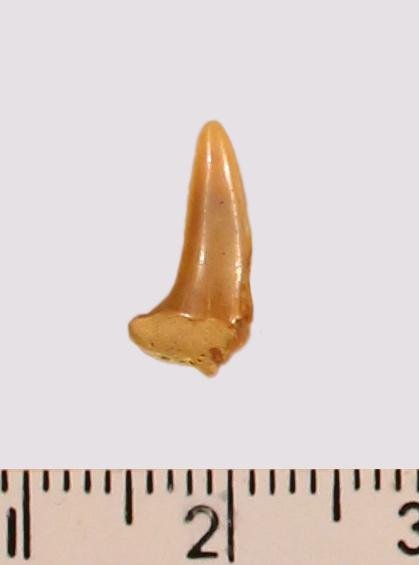 Зуб (фрагмент). Акула. Scapanorhynchus gigas Woodward 1889. Классификация: Хордовые Chordata, Позвоночные Vertebrata, Хрящевые рыбы Chondrichthyes, Пластиножаберные Elasmobranchii, Акулы Selachii, Ламнообразные Lamniformes