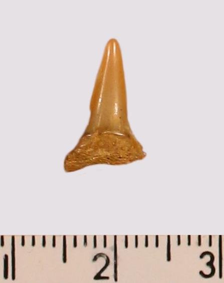 Зуб (фрагмент). Акула. Scapanorhynchus gigas Woodward 1889. Классификация: Хордовые Chordata, Позвоночные Vertebrata, Хрящевые рыбы Chondrichthyes, Пластиножаберные Elasmobranchii, Акулы Selachii, Ламнообразные Lamniformes