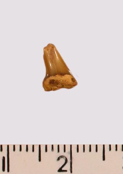 Зуб (фрагмент). Акула. Scapanorhynchus gigas Woodward 1889. Классификация: Хордовые Chordata, Позвоночные Vertebrata, Хрящевые рыбы Chondrichthyes, Пластиножаберные Elasmobranchii, Акулы Selachii, Ламнообразные Lamniformes