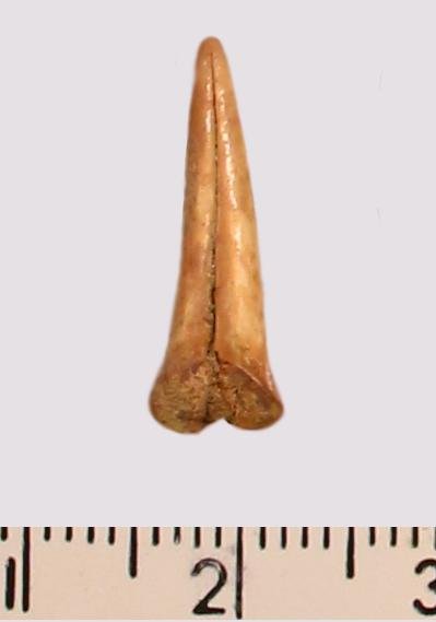 Зуб (фрагмент). Акула. Scapanorhynchus gigas Woodward 1889. Классификация: Хордовые Chordata, Позвоночные Vertebrata, Хрящевые рыбы Chondrichthyes, Пластиножаберные Elasmobranchii, Акулы Selachii, Ламнообразные Lamniformes