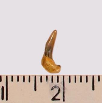 Коронка мелкого бокового зуба грязновато-бежевого цвета, режущего типа, с гладким режущим краем. С лингвальной стороны у основания коронки на эмали имеется скульптура в виде слабой продольной струйчатости. Корень охристый, сохранился фрагментарно.