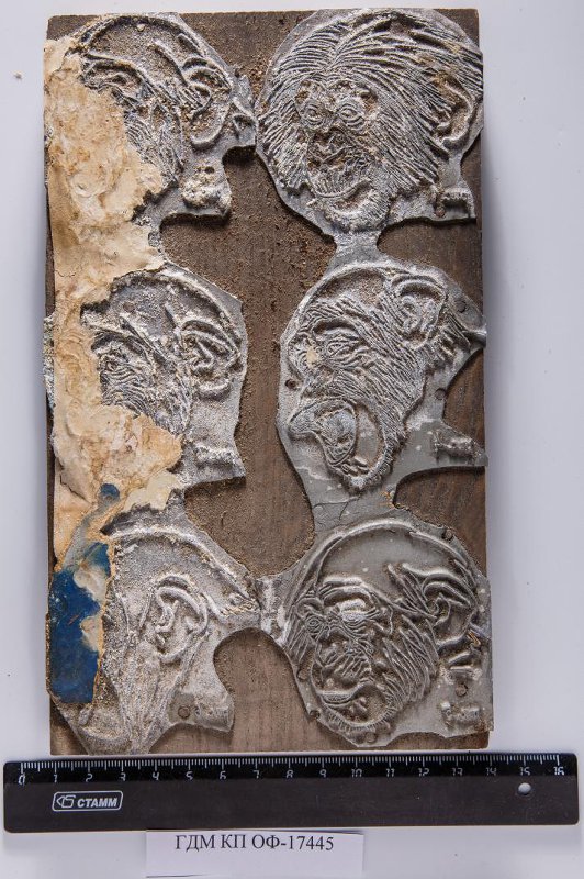 Клише для цинкографии. Металлическая фигурная пластина на деревянной основе. 6 рисунков голов шимпанзе по 2 в ряд.