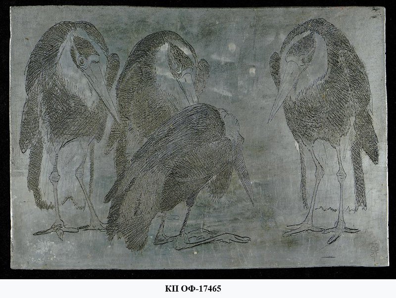 На листе крупно изображены четыре марабу, в центре композиции опустившийся на согнутых лапах марабу, остальне - смотрят на него. Оттиски - кп нвф 9426/77,78 .