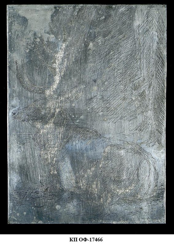 На листе крупно боком головой вправо изображен лежащий олень. За спиной животного слева намечены стволы деревьев. Оттиски - кп нвф 9426/84, 1459/89-94.