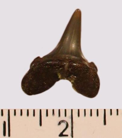 Зуб. Акула. Odontaspis macrorhiza (Cope) Leriche, 1902. Классификация: Хордовые Chordata, Позвоночные Vertebrata, Хрящевые рыбы Chondrichthyes, Пластиножаберные Elasmobranchii, Акулы Selachii, Ламнообразные Lamniformes