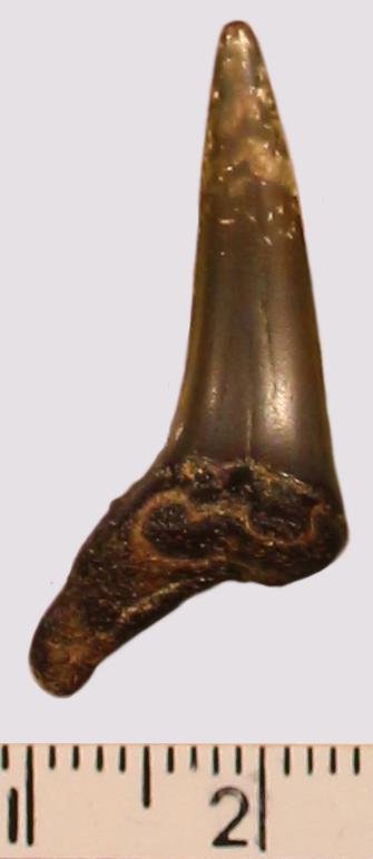Зуб. Акула. Scapanorhynchus rhaphiodon Agassiz 1843. Классификация: Хордовые Chordata, Позвоночные Vertebrata, Хрящевые рыбы Chondrichthyes, Пластиножаберные Elasmobranchii, Акулы Selachii, Ламнообразные Lamniformes