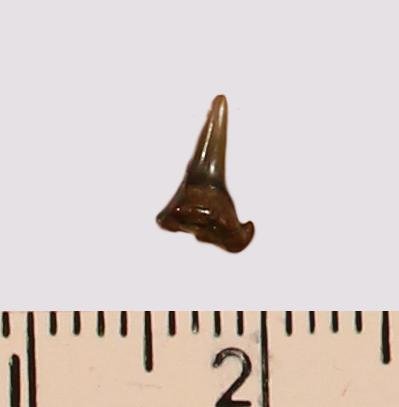Зуб (фрагмент). Акула. Synechodus dubrisiensis (Mackie, 1863). Классификация: Хордовые Chordata, Позвоночные Vertebrata, Хрящевые рыбы Chondrichthyes, Пластиножаберные Elasmobranchii, Акулы Selachii, Синеходонтообразные Synechodontiformes