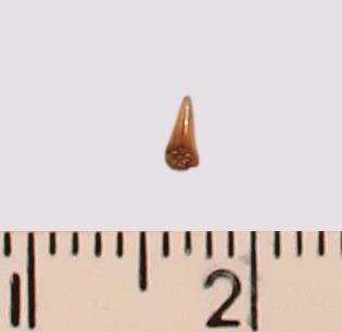 Зуб (фрагмент). Акула. Odontaspis subulata (Agassiz, 1843). Классификация: Хордовые Chordata, Позвоночные Vertebrata, Хрящевые рыбы Chondrichthyes, Пластиножаберные Elasmobranchii, Акулы Selachii, Ламнообразные Lamniformes