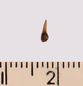 Зуб (фрагмент). Акула. Odontaspis subulata (Agassiz, 1843). Классификация: Хордовые Chordata, Позвоночные Vertebrata, Хрящевые рыбы Chondrichthyes, Пластиножаберные Elasmobranchii, Акулы Selachii, Ламнообразные Lamniformes