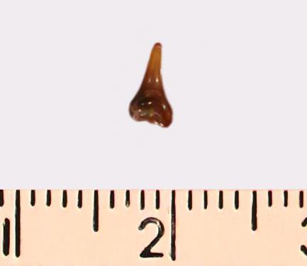 Зуб (фрагмент). Акула. Synechodus dubrisiensis (Mackie, 1863). Классификация: Хордовые Chordata, Позвоночные Vertebrata, Хрящевые рыбы Chondrichthyes, Пластиножаберные Elasmobranchii, Акулы Selachii, Синеходонтообразные Synechodontiformes