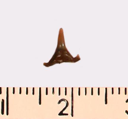 Зуб (фрагмент). Акула. Synechodus dubrisiensis (Mackie, 1863). Классификация: Хордовые Chordata, Позвоночные Vertebrata, Хрящевые рыбы Chondrichthyes, Пластиножаберные Elasmobranchii, Акулы Selachii, Синеходонтообразные Synechodontiformes