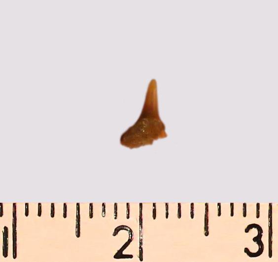 Зуб (фрагмент). Акула. Synechodus dubrisiensis (Mackie, 1863). Классификация: Хордовые Chordata, Позвоночные Vertebrata, Хрящевые рыбы Chondrichthyes, Пластиножаберные Elasmobranchii, Акулы Selachii, Синеходонтообразные Synechodontiformes