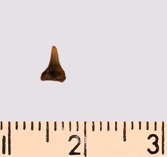 Зуб (фрагмент). Акула. Synechodus dubrisiensis (Mackie, 1863). Классификация: Хордовые Chordata, Позвоночные Vertebrata, Хрящевые рыбы Chondrichthyes, Пластиножаберные Elasmobranchii, Акулы Selachii, Синеходонтообразные Synechodontiformes