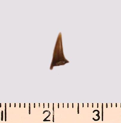 Зуб (фрагмент). Акула. Eostriatolamia subulata (Agassiz, 1843). Классификация: Хордовые Chordata, Позвоночные Vertebrata, Хрящевые рыбы Chondrichthyes, Пластиножаберные Elasmobranchii, Акулы Selachii, Ламнообразные Lamniformes
