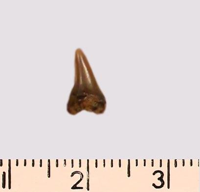 Зуб (фрагмент). Акула. Eostriatolamia subulata (Agassiz, 1843). Классификация: Хордовые Chordata, Позвоночные Vertebrata, Хрящевые рыбы Chondrichthyes, Пластиножаберные Elasmobranchii, Акулы Selachii, Ламнообразные Lamniformes
