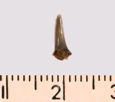 Зуб (фрагмент). Акула. Odontaspis subulata (Agassiz, 1843). Классификация: Хордовые Chordata, Позвоночные Vertebrata, Хрящевые рыбы Chondrichthyes, Пластиножаберные Elasmobranchii, Акулы Selachii, Ламнообразные Lamniformes
