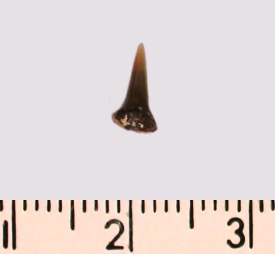 Зуб (фрагмент). Акула. Odontaspis subulata (Agassiz, 1843). Классификация: Хордовые Chordata, Позвоночные Vertebrata, Хрящевые рыбы Chondrichthyes, Пластиножаберные Elasmobranchii, Акулы Selachii, Ламнообразные Lamniformes
