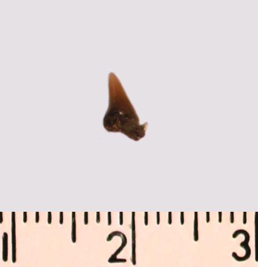 Зуб (фрагмент). Акула. Odontaspis subulata (Agassiz, 1843). Классификация: Хордовые Chordata, Позвоночные Vertebrata, Хрящевые рыбы Chondrichthyes, Пластиножаберные Elasmobranchii, Акулы Selachii, Ламнообразные Lamniformes