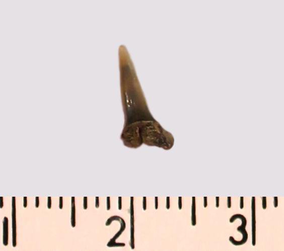 Зуб (фрагмент). Акула. Odontaspis subulata (Agassiz, 1843). Классификация: Хордовые Chordata, Позвоночные Vertebrata, Хрящевые рыбы Chondrichthyes, Пластиножаберные Elasmobranchii, Акулы Selachii, Ламнообразные Lamniformes
