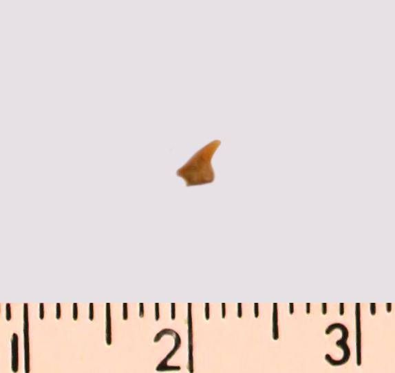 Зуб (фрагмент). Акула. Odontaspis striatula Dalinkevicius, 1935. Классификация: Хордовые Chordata, Позвоночные Vertebrata, Хрящевые рыбы Chondrichthyes, Пластиножаберные Elasmobranchii, Акулы Selachii, Ламнообразные Lamniformes