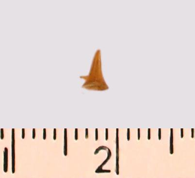Зуб (фрагмент). Акула. Odontaspis striatula Dalinkevicius, 1935. Классификация: Хордовые Chordata, Позвоночные Vertebrata, Хрящевые рыбы Chondrichthyes, Пластиножаберные Elasmobranchii, Акулы Selachii, Ламнообразные Lamniformes