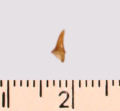 Зуб (фрагмент). Акула. Odontaspis striatula Dalinkevicius, 1935. Классификация: Хордовые Chordata, Позвоночные Vertebrata, Хрящевые рыбы Chondrichthyes, Пластиножаберные Elasmobranchii, Акулы Selachii, Ламнообразные Lamniformes