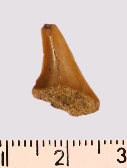 Зуб (фрагмент). Акула. Cretoxyrhina denticulata (Gluckman, 1957). Классификация: Хордовые Chordata, Позвоночные Vertebrata, Хрящевые рыбы Chondrichthyes, Пластиножаберные Elasmobranchii, Акулы Selachii, Ламнообразные Lamniformes