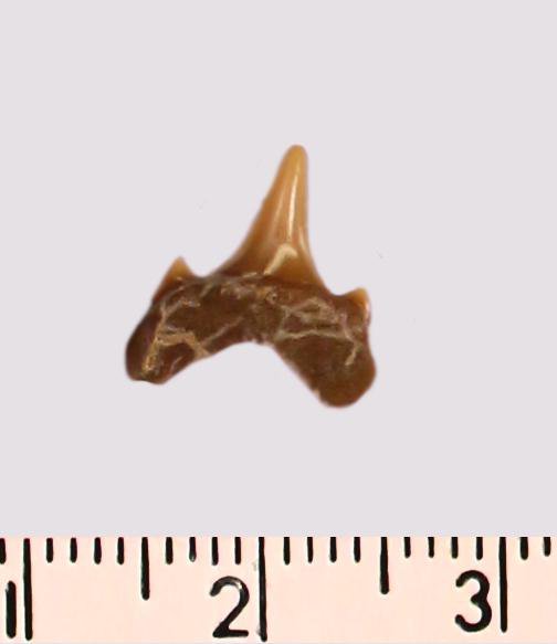 Зуб. Акула. Odontaspis macrorhiza (Cope) Leriche, 1902. Классификация: Хордовые Chordata, Позвоночные Vertebrata, Хрящевые рыбы Chondrichthyes, Пластиножаберные Elasmobranchii, Акулы Selachii, Ламнообразные Lamniformes