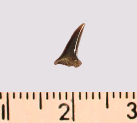 Зуб (фрагмент). Акула. Odontaspis striatula Dalinkevicius, 1935. Классификация: Хордовые Chordata, Позвоночные Vertebrata, Хрящевые рыбы Chondrichthyes, Пластиножаберные Elasmobranchii, Акулы Selachii, Ламнообразные Lamniformes