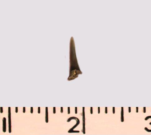 Зуб (фрагмент). Акула. Odontaspis striatula Dalinkevicius, 1935. Классификация: Хордовые Chordata, Позвоночные Vertebrata, Хрящевые рыбы Chondrichthyes, Пластиножаберные Elasmobranchii, Акулы Selachii, Ламнообразные Lamniformes