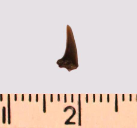 Зуб (фрагмент). Акула. Odontaspis striatula Dalinkevicius, 1935. Классификация: Хордовые Chordata, Позвоночные Vertebrata, Хрящевые рыбы Chondrichthyes, Пластиножаберные Elasmobranchii, Акулы Selachii, Ламнообразные Lamniformes