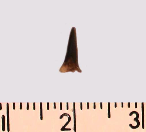 Зуб (фрагмент). Акула. Odontaspis striatula Dalinkevicius, 1935. Классификация: Хордовые Chordata, Позвоночные Vertebrata, Хрящевые рыбы Chondrichthyes, Пластиножаберные Elasmobranchii, Акулы Selachii, Ламнообразные Lamniformes