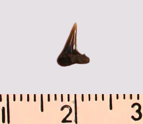 Зуб (фрагмент). Акула. Odontaspis striatula Dalinkevicius, 1935. Классификация: Хордовые Chordata, Позвоночные Vertebrata, Хрящевые рыбы Chondrichthyes, Пластиножаберные Elasmobranchii, Акулы Selachii, Ламнообразные Lamniformes