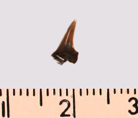 Зуб (фрагмент). Акула. Odontaspis striatula Dalinkevicius, 1935. Классификация: Хордовые Chordata, Позвоночные Vertebrata, Хрящевые рыбы Chondrichthyes, Пластиножаберные Elasmobranchii, Акулы Selachii, Ламнообразные Lamniformes