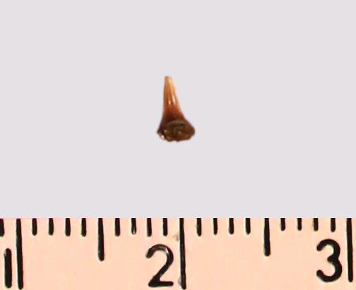 Зуб (фрагмент). Акула. Odontaspis striatula Dalinkevicius, 1935. Классификация: Хордовые Chordata, Позвоночные Vertebrata, Хрящевые рыбы Chondrichthyes, Пластиножаберные Elasmobranchii, Акулы Selachii, Ламнообразные Lamniformes