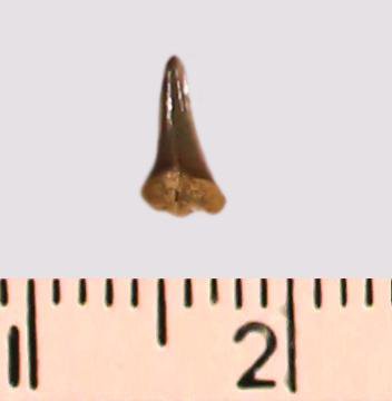 Зуб (фрагмент). Акула. Odontaspis striatula Dalinkevicius, 1935. Классификация: Хордовые Chordata, Позвоночные Vertebrata, Хрящевые рыбы Chondrichthyes, Пластиножаберные Elasmobranchii, Акулы Selachii, Ламнообразные Lamniformes