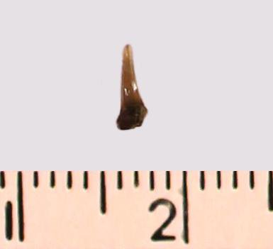 Зуб (фрагмент). Акула. Odontaspis striatula Dalinkevicius, 1935. Классификация: Хордовые Chordata, Позвоночные Vertebrata, Хрящевые рыбы Chondrichthyes, Пластиножаберные Elasmobranchii, Акулы Selachii, Ламнообразные Lamniformes