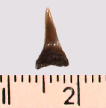 Зуб (фрагмент). Акула. Odontaspis striatula Dalinkevicius, 1935. Классификация: Хордовые Chordata, Позвоночные Vertebrata, Хрящевые рыбы Chondrichthyes, Пластиножаберные Elasmobranchii, Акулы Selachii, Ламнообразные Lamniformes