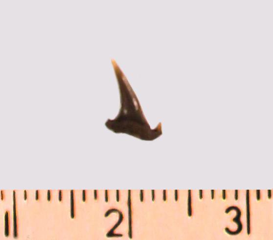Зуб (фрагмент). Акула. Odontaspis striatula Dalinkevicius, 1935. Классификация: Хордовые Chordata, Позвоночные Vertebrata, Хрящевые рыбы Chondrichthyes, Пластиножаберные Elasmobranchii, Акулы Selachii, Ламнообразные Lamniformes