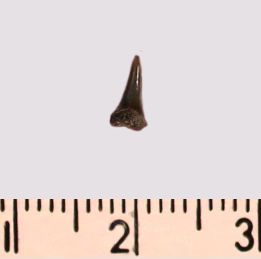 Зуб (фрагмент). Акула. Odontaspis striatula Dalinkevicius, 1935. Классификация: Хордовые Chordata, Позвоночные Vertebrata, Хрящевые рыбы Chondrichthyes, Пластиножаберные Elasmobranchii, Акулы Selachii, Ламнообразные Lamniformes