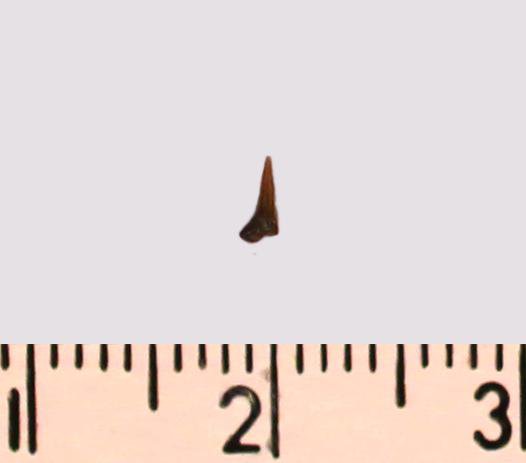 Зуб (фрагмент). Акула. Odontaspis striatula Dalinkevicius, 1935. Классификация: Хордовые Chordata, Позвоночные Vertebrata, Хрящевые рыбы Chondrichthyes, Пластиножаберные Elasmobranchii, Акулы Selachii, Ламнообразные Lamniformes
